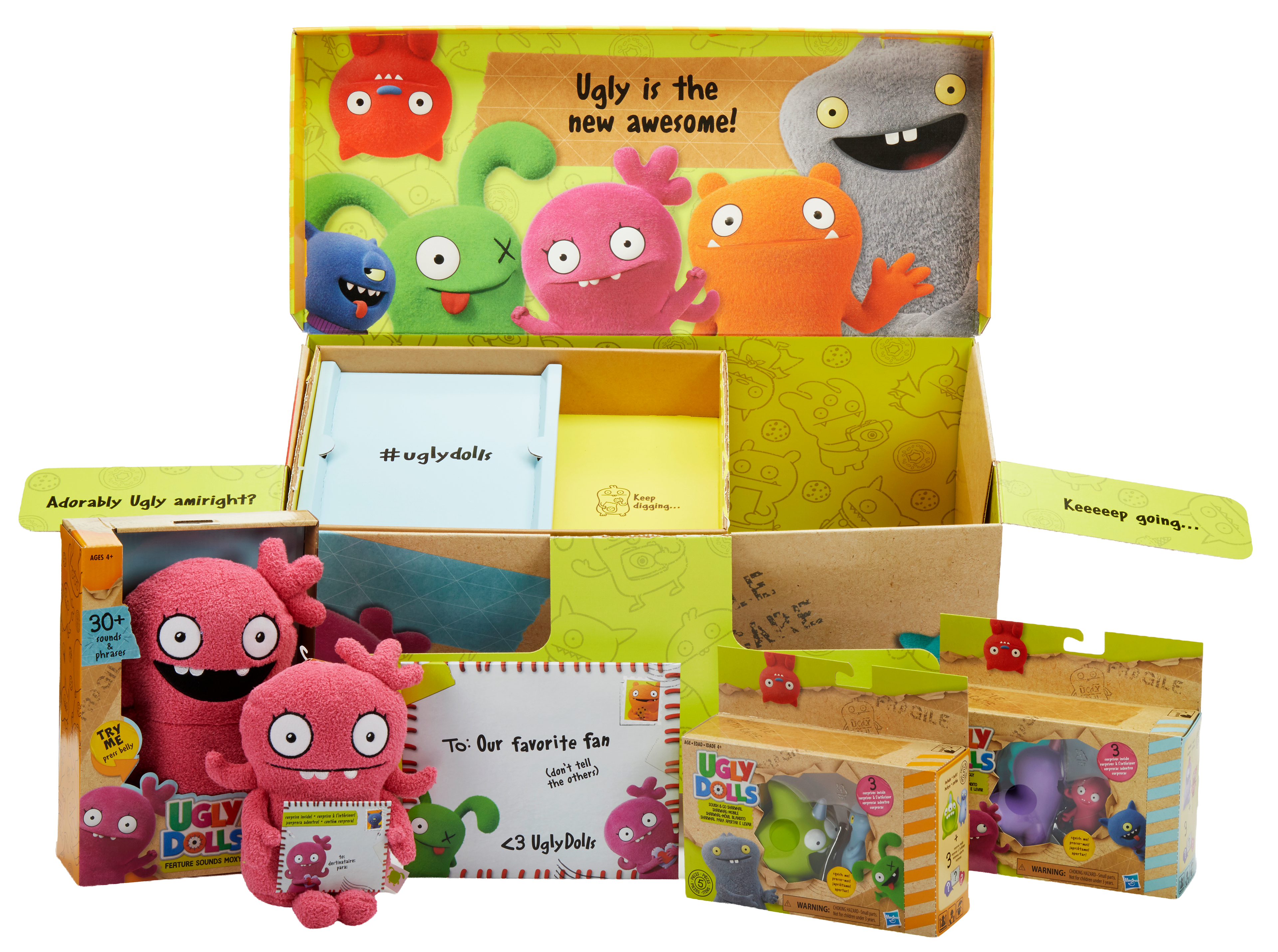 Time to get ugly, this line was created to go along with the theatrical release of The Ugly Dolls movie. The packaging line was inspired by the original love letter that inspired the Ugly Doll brand which is why you will see elements like packaging tape, stamps and box texture throughout the line.